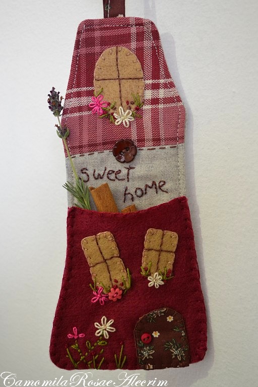Depois de costurada a casinha, fiz as janelas e porta com feltro e preguei com o ponto caseado.