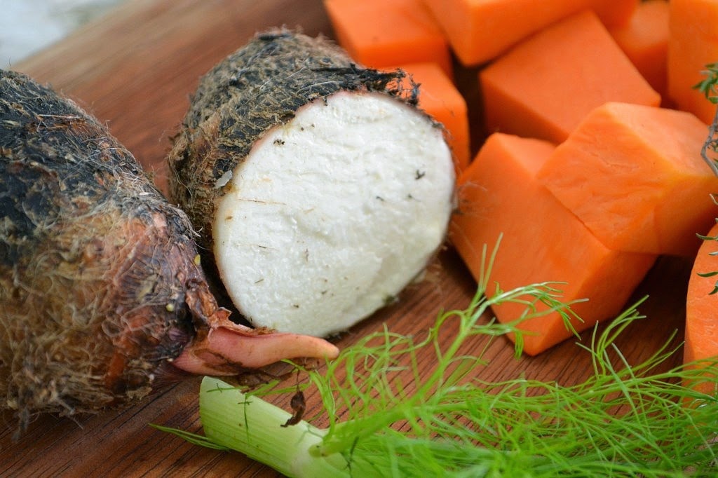 Inhame, batata, abóbora, pimentão, cebola, alho, tomilho e a erva-doce!
