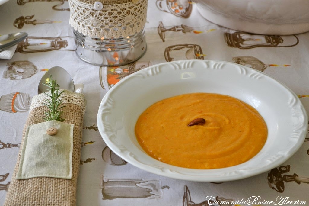 Neste post vou falar de uma deliciosa sopa de abóbora, enriquecida com outros legumes e um ingrediente especial aromático, e também mostrar uma arte com juta para enfeitar a mesa, muito fácil de fazer.