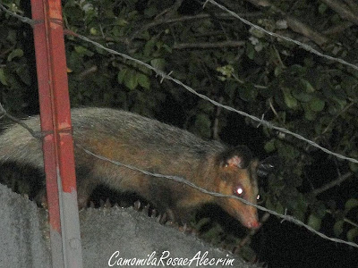 Esta semana enquanto eu passava roupas tarde da noite por causa do calor, percebi um movimento, peguei a câmera e era um simpático gambá passeando pelos muros do quintal.