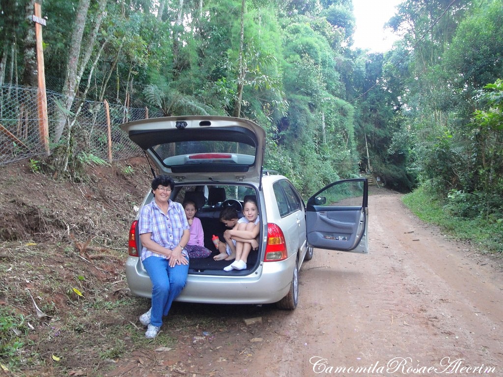 Depois de andar muito na terra e plantar girassol as crianças voltaram sem sapatos num pedaço da estrada no porta malas...e se divertiram!
