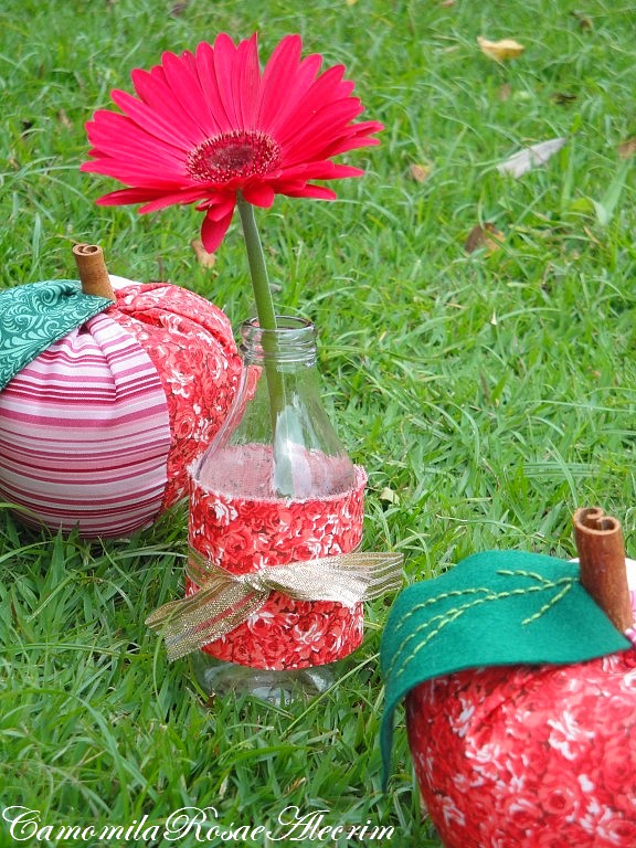 Fiz também uma maçã pequena e enfeitei o vasinho reciclado, depois levei para dentro e deixei na sala com flores frescas...vejo sempre essa ideia em outros Blogs, é muito legal usar esses vidros (que já foi vidro de leite de coco).