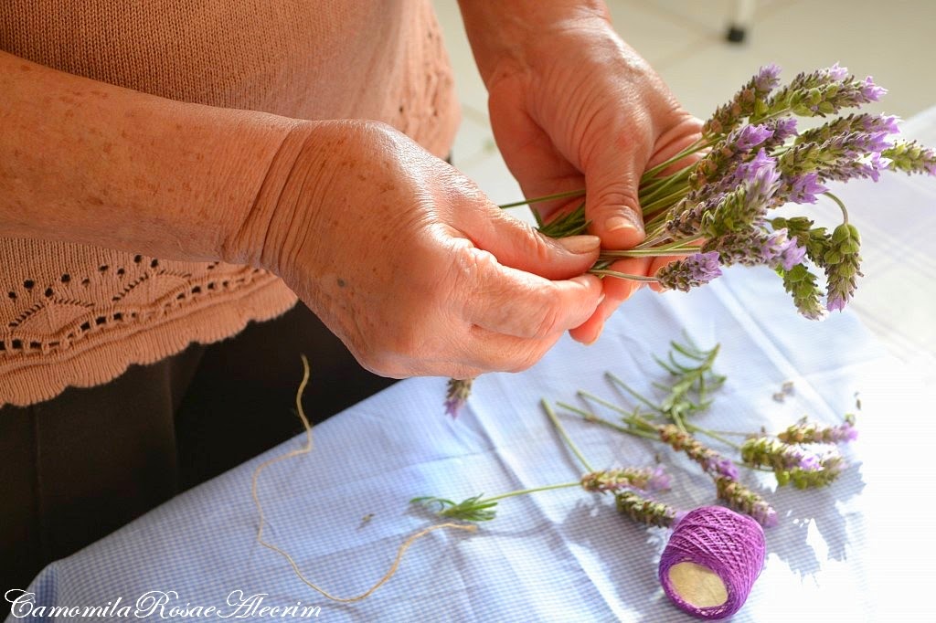 Mamãe Alfazema faz um pequeno buque de alfazemas do meu quintal e começamos a costurar com o quartelier perfumado.
