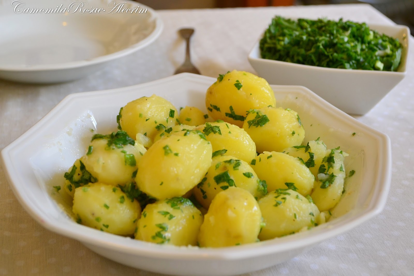 Lindas e SIMPLES batatas cozidas, temperadas ainda quente com manteiga salsinha, cebolinha, alecrim e sal.