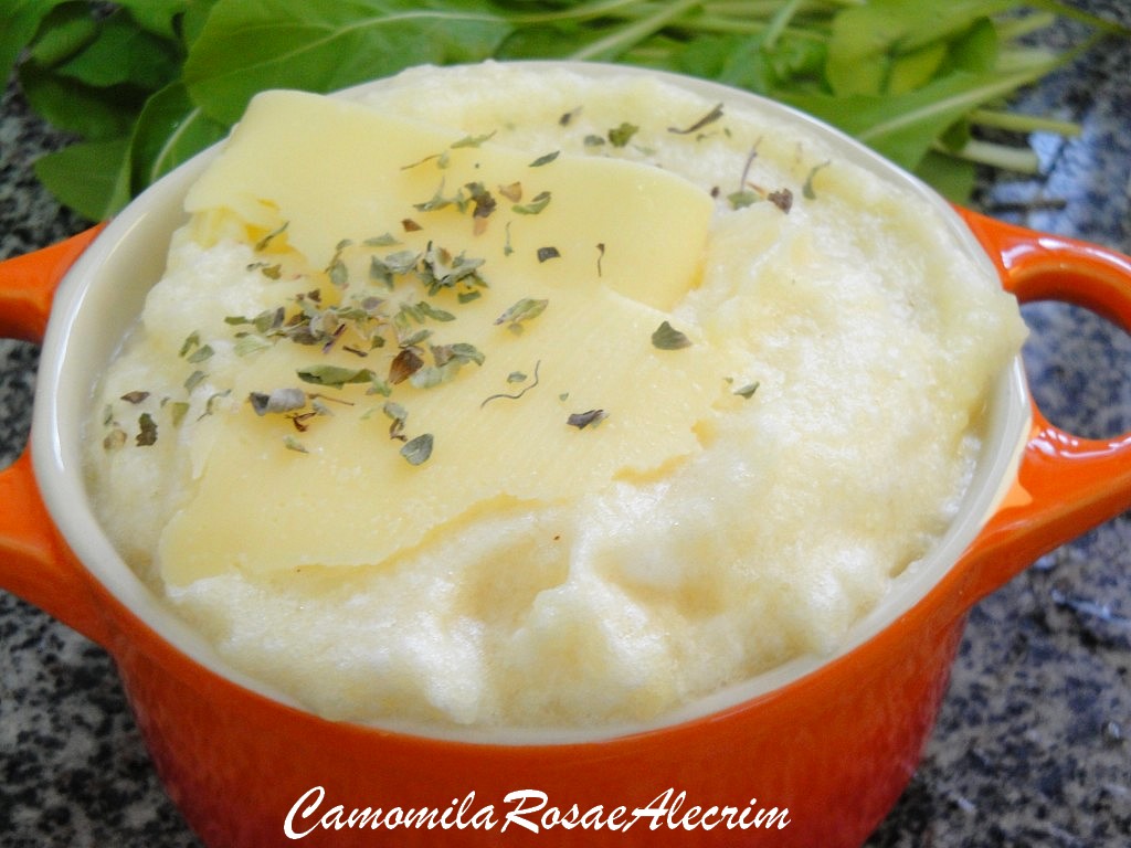 Fiz uma carne, arroz, salada e resolvi testar uma receita de suflê de batatas com recheio de queijo cheddar.