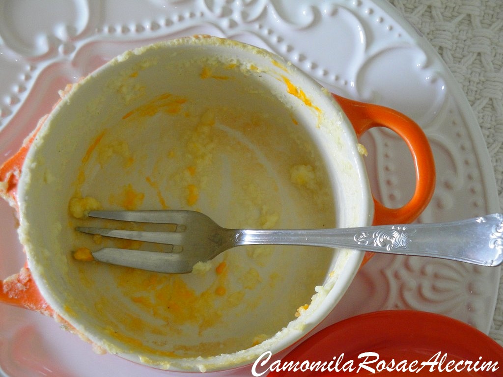 Misture bem e por fim acrescente as claras em neve. Misture mais um pouco e coloque nas caçarolas até a metade, recheie com o cheddar e coloque o resto da massa do suflê.