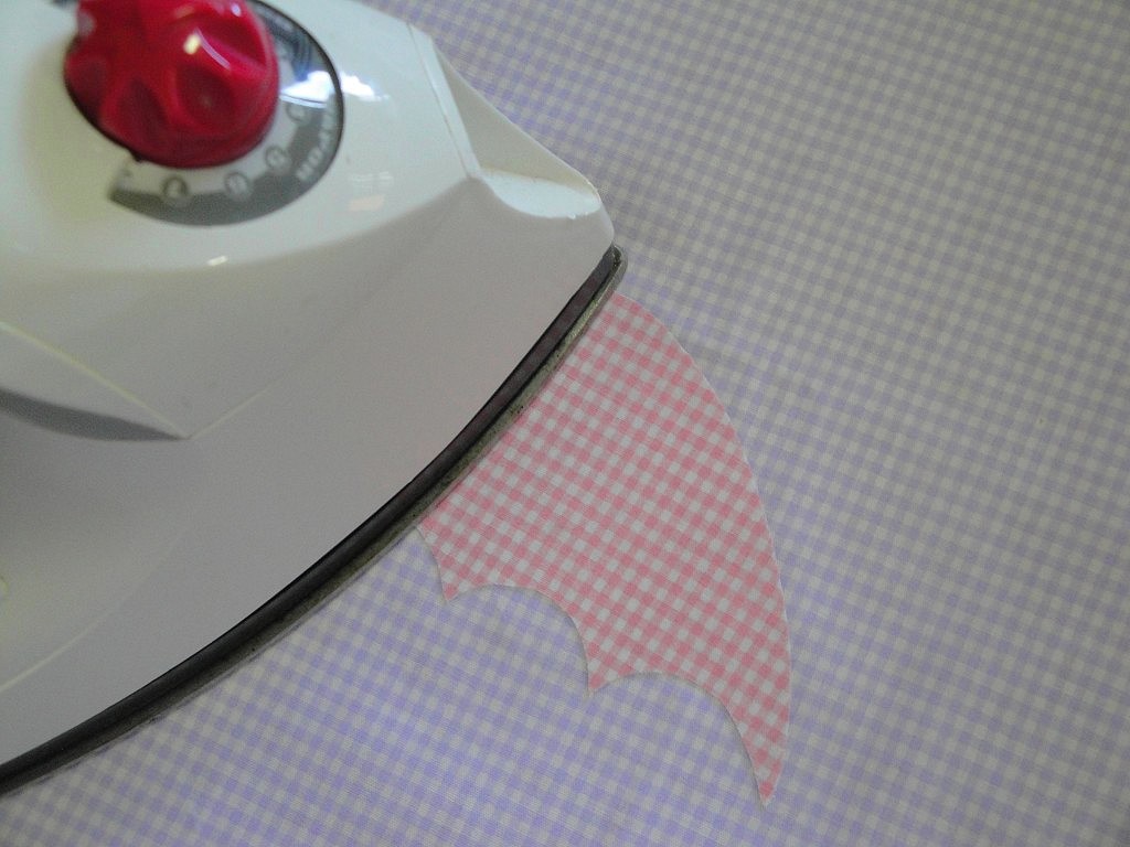 Desenhei no papel termocolante o desenho (no lado fosco) e depois coloquei no lado avesso do tecido e passei a ferro sem vapor. E então recortei o desenho bem em cima do risco e tirei a parte adesiva.