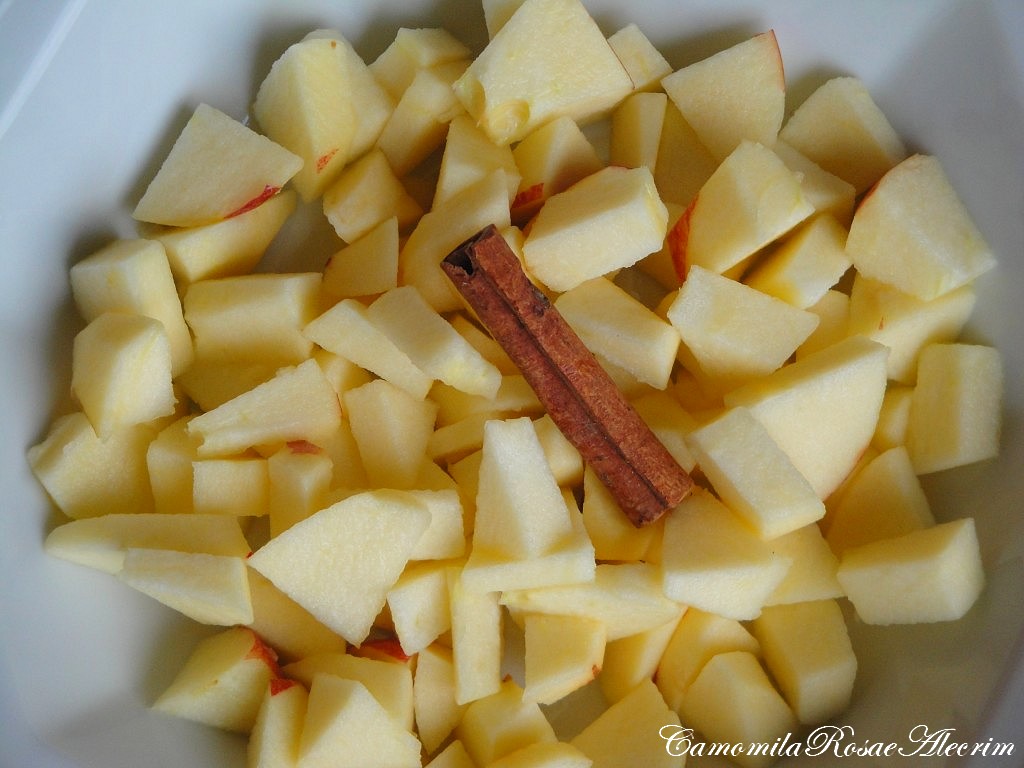 Depois que a calda está pronta e com a cor de caramelo eu acrescento a maçã e a canela e deixo cozinhar por uns 15 minutos. E está pronta...